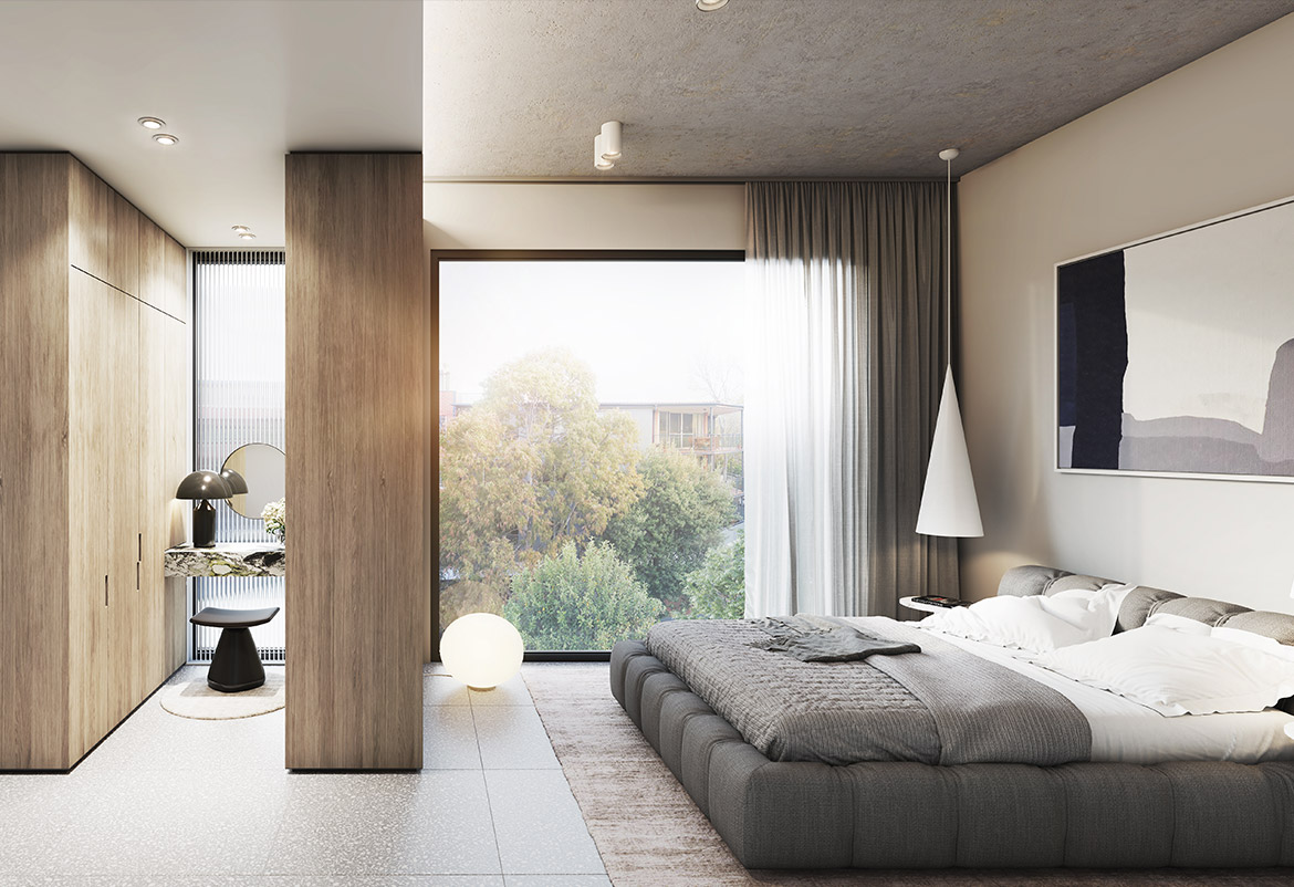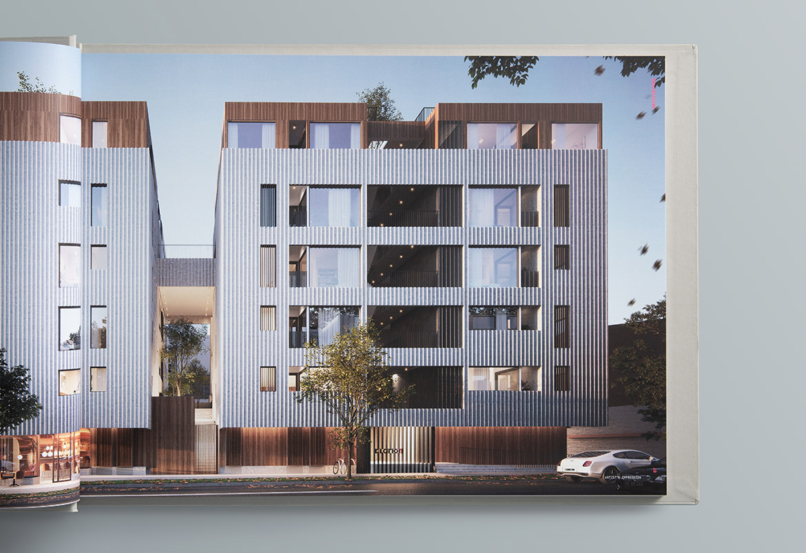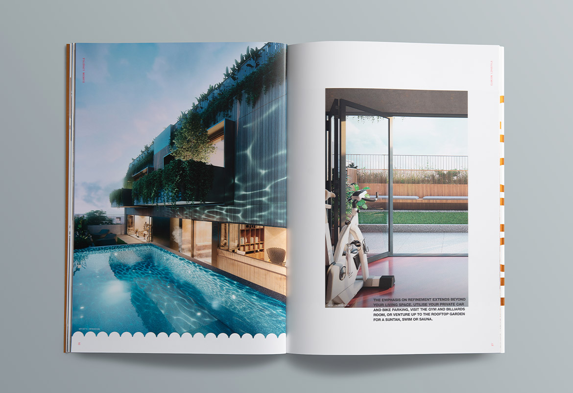 The campaign brand was a direct response to the perceived audience, and intelligent and sophisticated in tone. The building itself featured an uncompromising scalloped concrete facade which was a cue for many of the design elements. The interiors seamlessly flowed from inside to outside with private courtyards, the headline typography mimicked this with internal line work that passed seamlessly across images into white space.