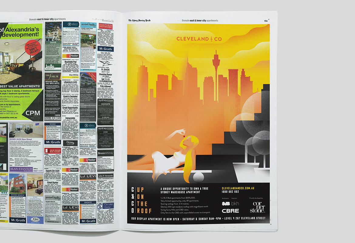 Hoyne created the type of personality you might see cruising down Cleveland Street – brogues shined to the nines, beard unkempt, hangover raging (and unequivocally shameless). A set of dynamic posters were created to draw out the unique character of Redfern and Surry Hills, perforating the general property-marketing noise that was ubiquitous in Surry Hills at the time.