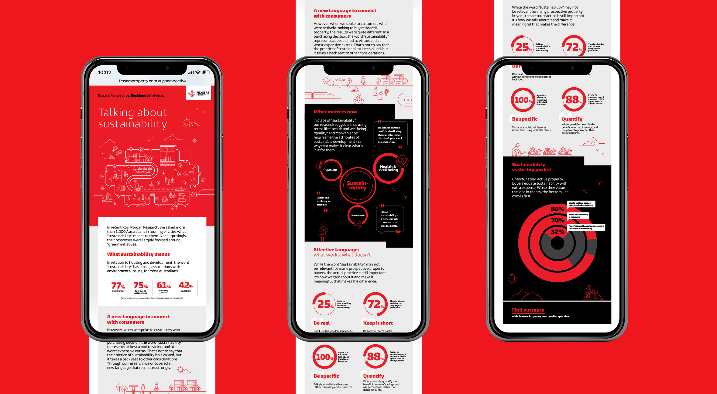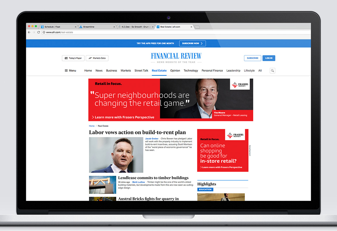 Targeting property industry peers, as well as government and finance decision-makers, Hoyne created Frasers Perspective — a thought-leadership hub and online portal that enabled a thematic showcase of Frasers Property’s extensive expertise and value. Hosting articles, a podcast, video, infographics and opinion pieces, Frasers Perspective provided a platform to inform and engage audiences with quarterly themes based on industry sectors and topics. The portal and themes were advertised across digital, social and press through targeted media buys. Campaign creative focused on bringing Frasers Property experience front and centre with an emphasis on Frasers Property experts and insights.