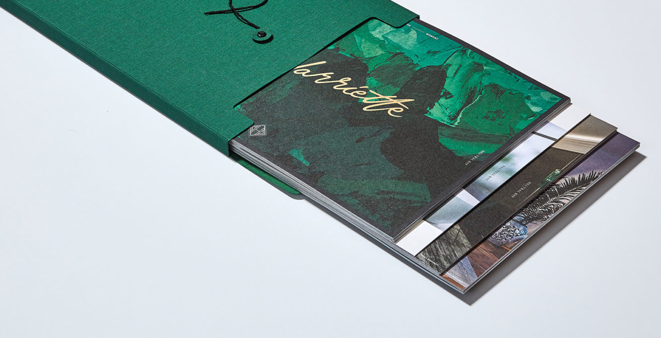 Deep greens and bold blacks created depth of character, while gold and white accents mirrored the light and space offered by the property. To create a more sensory and indulgent interaction, we produced a set of tactile cards instead of a brochure. This allowed readers to spend longer taking in the moment that each card celebrated, while also allowing for an experience that could be viewed in any order, according to individual interest.