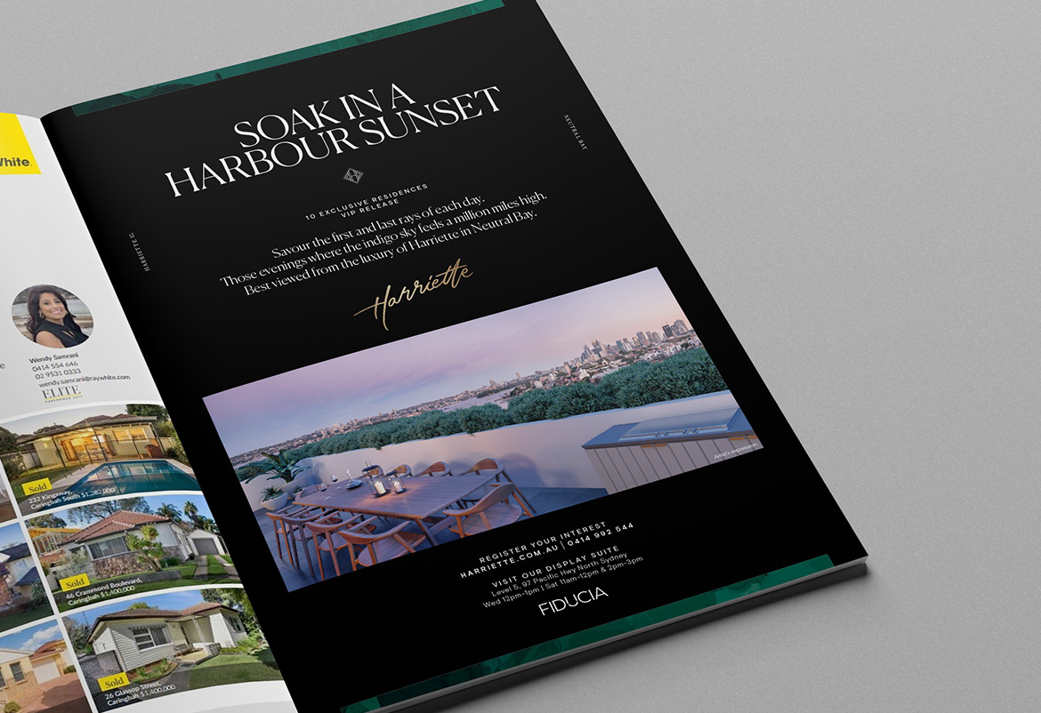 In the Lower North Shore residential property market, designing a standout campaign is no easy task, but this is exactly what a luxury boutique development in Neutral Bay, Harriette, demanded. Comprising 8 apartments, 2 penthouses and landscaped surrounds, Harriette is the vision of developer Fiducia, and PBD Architects. The Fiducia team knew a point of difference was crucial if the project was to stand out in Neutral Bay’s crowded market. The quality of finish and attention to detail that Harriette would offer were unique, as was the inclusion of a private wine room with individual cellars for residents. Knowing the exclusivity of the street and the sensibility of our target audiences, a level of sophistication and personalisation were a must in order to clearly communicate an understated aesthetic and timeless appeal.