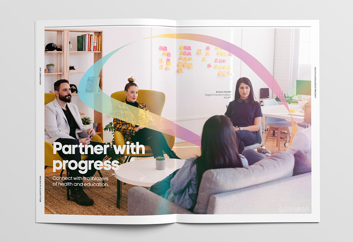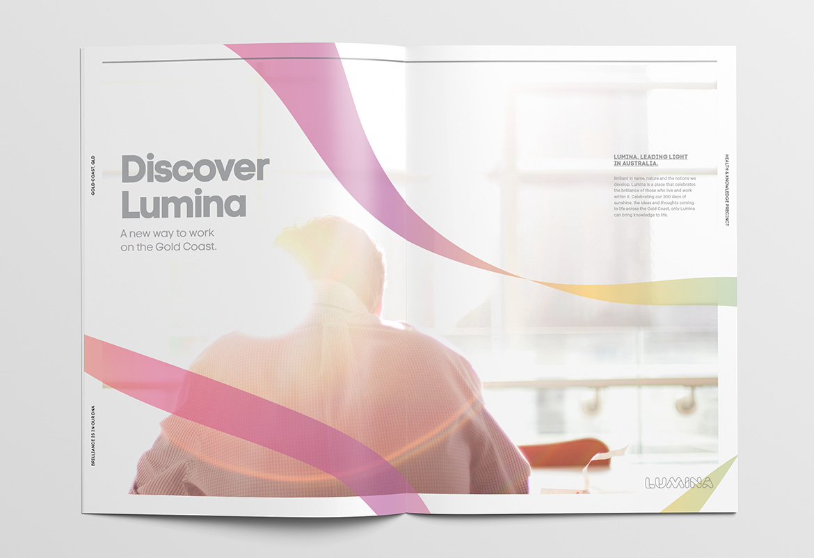Hoyne created the name Lumina to embody a narrative of game-changing brilliance and the personal talent and passion of individuals in pursuit of it. The name also captures the power of the place as a whole, illuminating life and learning for individuals and the wider community. Amplifying this foundation is a DNA-inspired graphic system that shines and ripples with ever-evolving discoveries. A playfully bright colour palette was purposefully incorporated to distinguish Lumina from a sea of traditionally blue-toned identities related to health.