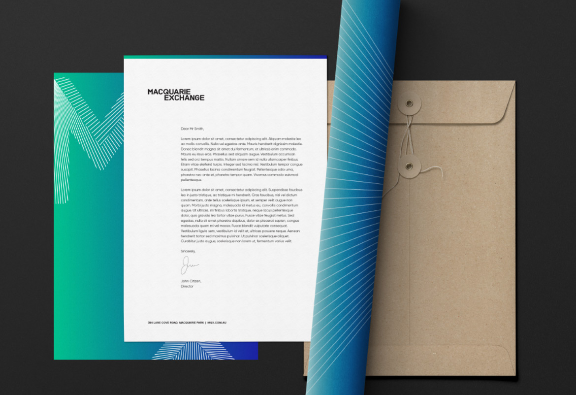 The Macquarie Exchange brand communicates energy and power through a vivid, gradient colour palette. The perception of constant momentum is created through the combination of imagery and line patterns. The bespoke typeface offers three font choices: a solid form to use for facts and information; divided letters to reflect the sites laneways; and a font comprised of multiple lines to represent the site’s connectivity and social potential.
