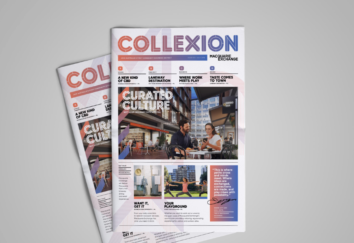 Frasers Property and Winten Property Group’s Macquarie Exchange is a 15,620 sqm commercial precinct, with four buildings and integrated laneways and collaboration spaces that will be activated seven days a week. Hoyne was approached to deliver a brand identity and a suite of visual communications to appeal to new tenants and celebrate this dynamic new destination for both workers and visitors.