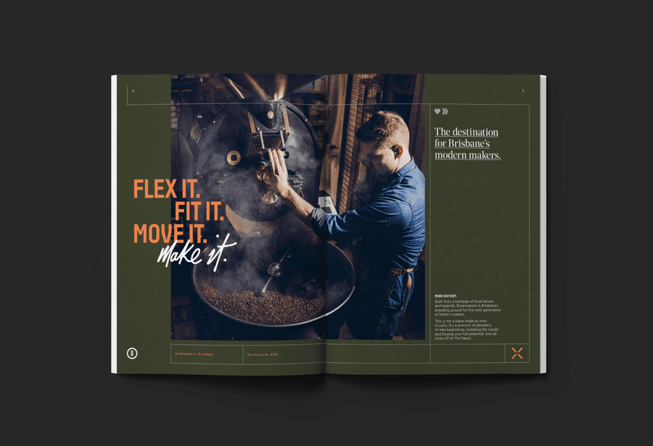 Rivermakers is the largest business park within 10km of Brisbane CBD. BMI engaged Hoyne to transform the 30-hectare abandoned site into a vibrant destination for work, leisure, and community connection. Unlike typical industrial estates, Rivermakers was designed with people in mind. Through our Place Visioning™ process, the site was zoned to support activity from morning to night, blending commercial use with F&B offerings, outdoor spaces, and heritage elements. The campaign and brand, built around the idea of ‘Make History’, captures Rivermakers’ pioneering spirit and community focus. The name, visual language, and tone of voice reflect it’s industrial character and invites engagement.