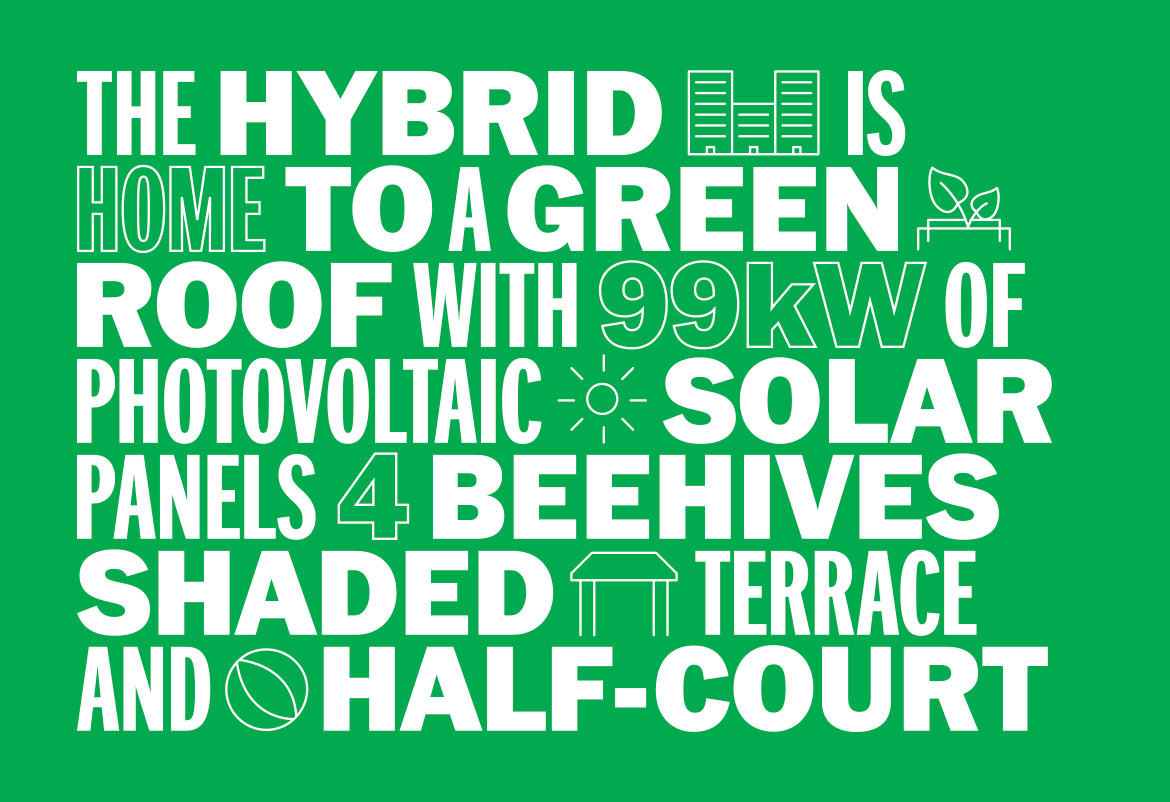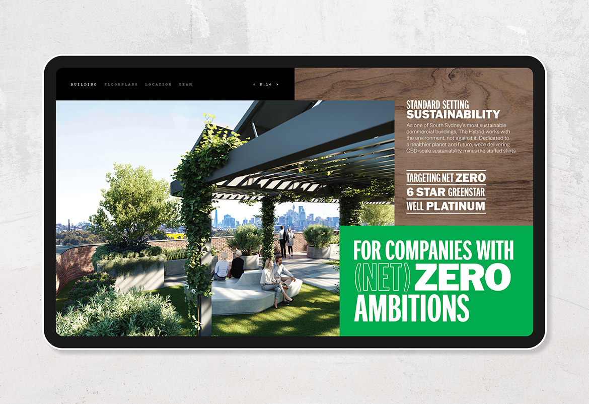A hybrid timber, steel and brick structure with an emphasis on technology, The Hybrid will be one of Australia’s most sustainable buildings. A 16,000sqm, 10-level, A-Grade office building, with a solar farm, outdoor spaces and a rooftop basketball court, it is aimed at tenants who think “outside the box”. The building’s design and the developer’s approach to client-tenant relationships reflect a pioneering mindset which Hoyne harnessed for the brand and campaign. Notable for a disruptive and dynamic spirit and whip smart, witty language, all creative was designed for digital first, with text, logos and graphics adapting seamlessly to their location.