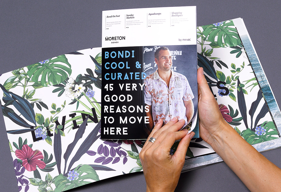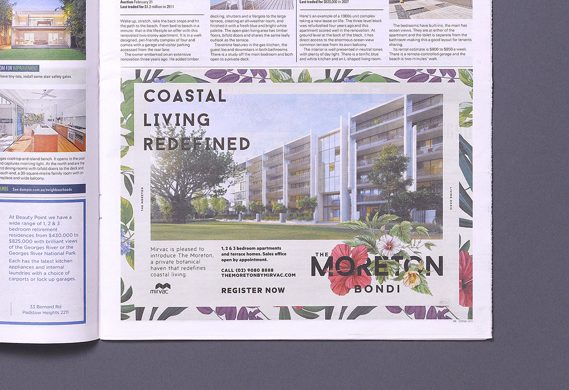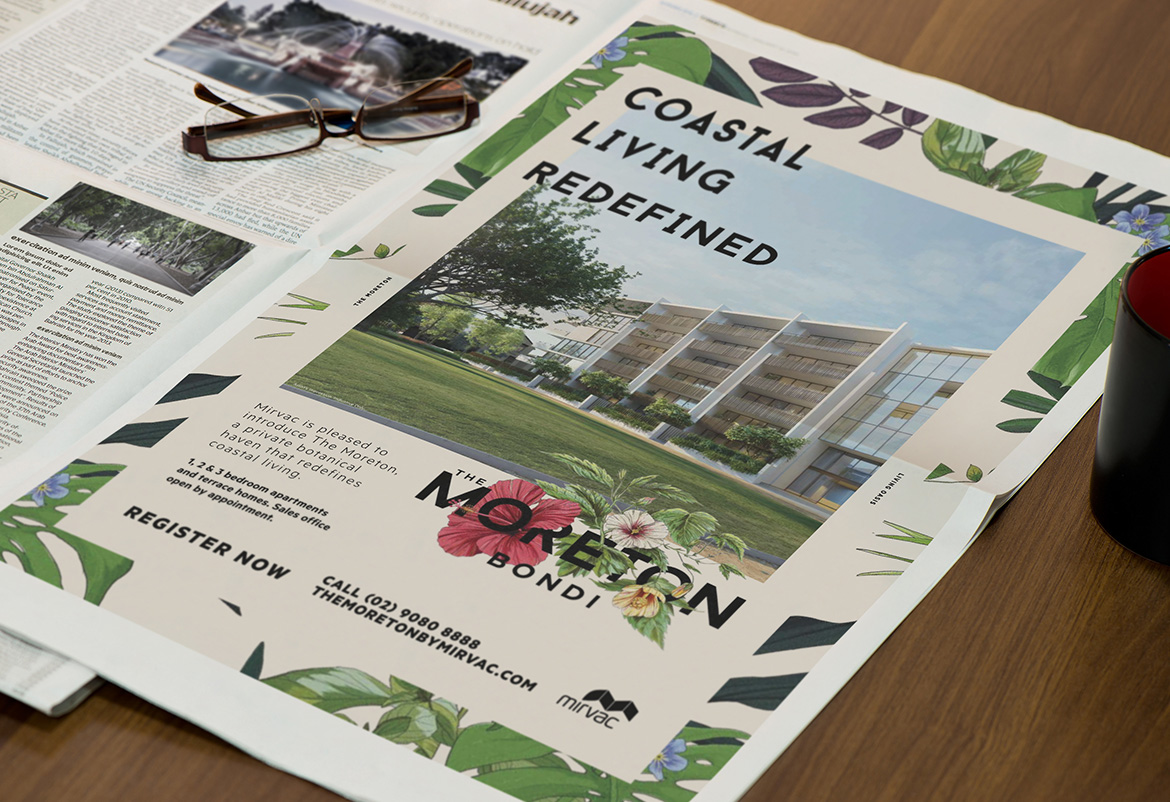 As a result, branding of The Moreton, Bondi, took the unconventional route of focusing on its lush green landscape rather than the postcard image of surf and sand. A visually rich identity, inspired by ‘botanist diary’ illustrations, was created which complemented the positioning statement, ‘Living Oasis’. The focus on the lush surroundings and heritage of the site was matched by communication of the lifestyle benefits that residents could anticipate – as well as the sophistication of the premium address and product.